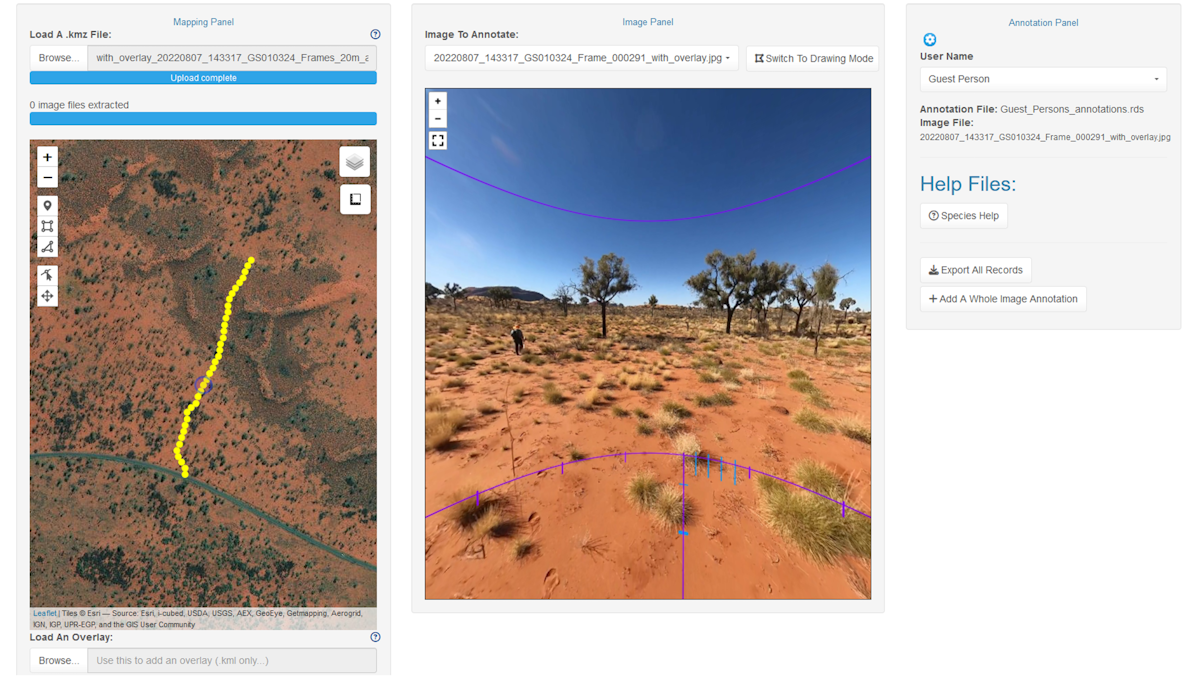 The pannotator graphical user interface contains three panels. The Mapping Panel (Figure 1, left) contains a button for selecting a .kmz file containing one or more images, a window for rendering the geolocation of images in the .kmz file onto satellite imagery or user-selectable maps, and several spatial mapping tools. The Image Panel (Figure 1, centre) contains a dropdown menu for navigating to individual image files and a window that loads the equirectangular image into 360-degree panoramic viewing mode using the Pannellum web viewer. It also allows the user to view and draw on flattened equirectangular images and export cropped sub-images. The Annotation Panel (right panel, Figure 1) contains a settings button (cog), image and annotation file information and a series of customisable dropdown menus that contain user names, help files, image annotation functionality, and export functions. This Shiny app relies on several R packages including leaflet, leaflet.extras, shinyFiles, exiftoolr and shinywidgets for key functionality.