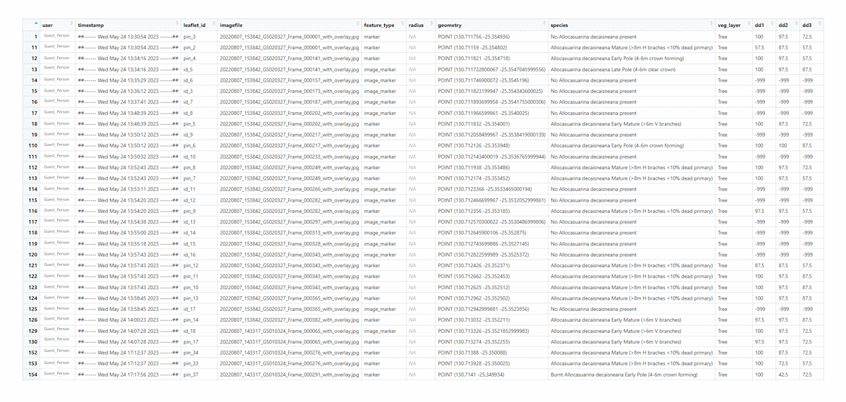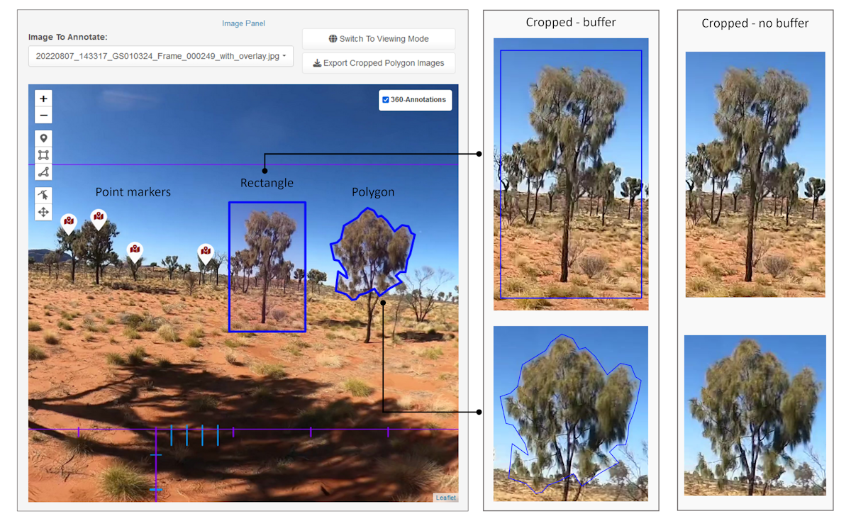 A new data record is added to a selected equirectangular image by clicking the ‘Add A Whole Image Annotation’ button (Figure 8). In the example provided the presence of the plant species (desert oak, Allocasuarina decaisneana) is added to the image annotation. Dropdown menus for adding records are user defined according to the requirements of the project. Multiple new records can be added to each whole image; these are clustered in the Mapping Panel and exploded by clicking the cluster icon.