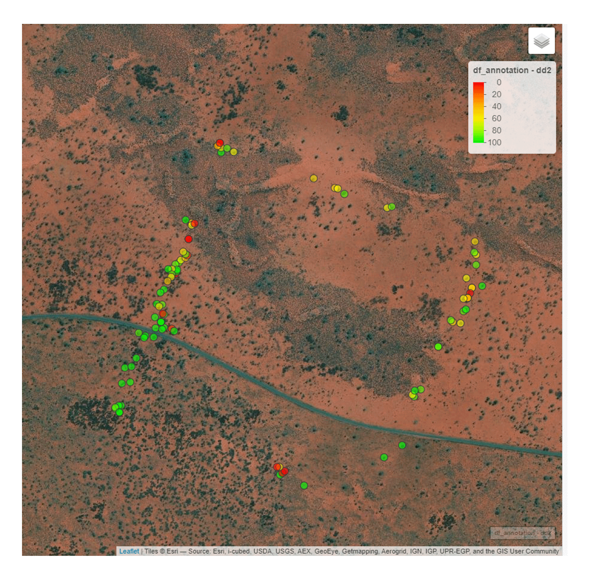 Below is a simple example of R code for visualising a sample of exported data using the R package mapview. Quarto files that contain a complete set of code for extracting and visualising species distribution data, cover data and tree crown health data, and that validate data extracted from images compared to data collected in the field are provided in the accompanying pannotator_examples and pannotator_data_validation files.