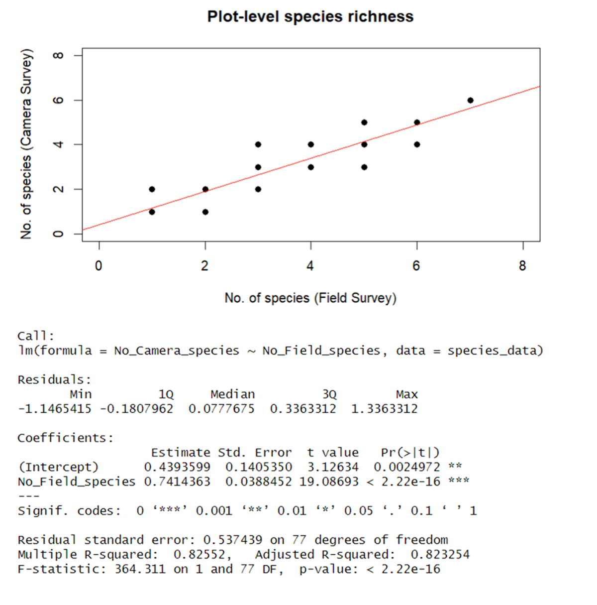 model <- lm(No_Camera_species ~ No_Field_species, data = species_data)