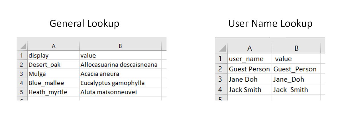 In the ‘Lookups’ Panel (Figure 2, right) you can specify up to four data fields that will be used to annotate the images. The name of the data field name can be specified in the ‘Lookup Label’ text boxes. The categories for the data field are specified in an accompanying .csv file which can be linked using the ‘Lookup csv File’ browse buttons. The Lookup csv file has two columns: 1) a ‘display’ column and 2) a ‘value’ column (Figure 3, left). The text in the ‘display’ column will appear in the Lookup drop down menu and the ‘value’ will saved to the annotation file. This way your ‘display’ category can differ from the data field in the export file if needed. An accompanying .pdf help file can be uploaded to assist the annotator using the Lookup Help File browse buttons. The help file can then be accessed using buttons created in the Annotation Panel (see below).