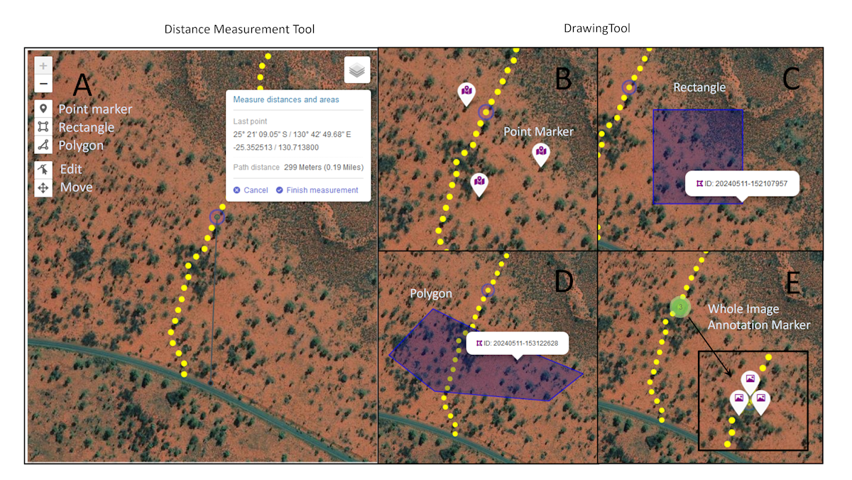 The drawing toolbar allows the user to drop specific geolocation point markers (Figure 5B), rectangles (Figure 5C) and complex polygons (Figure 5D) to which data may be then added using dropdown menus in the Annotation Panel. The appearance of these geometric objects (geometries) can be altered in the Mapping Panel Settings window. The toolbar also contains options to move and edit all geometric objects. Whole image annotation markers (Figure 5E) are added in the Annotation Panel.
