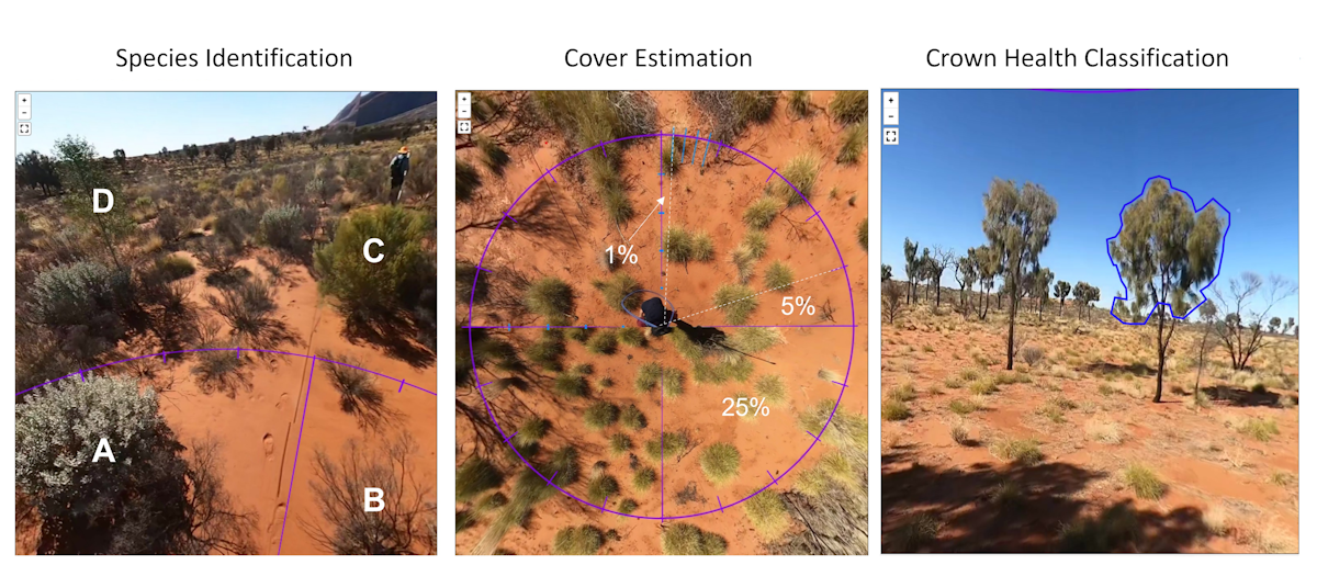 The 360-degree Viewing Mode allows the user to extract target information from each selected image. Figure 6 (below) shows several key ecological applications, including species identification and mapping (left), estimation of vertically projected ground-layer vegetation cover (centre), and estimation of crown health for individual trees (right). In each case data annotation is performed in the Annotation Panel using help files as visual and/or descriptive aids (see below).
