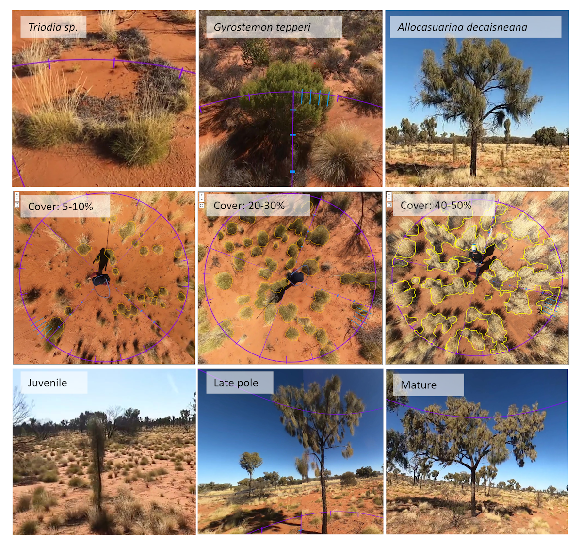 Estimation of vertically projected ground layer cover may be assisted by overlaying sampling templates constructed from reference images (eg., camera images containing plots of specified size laid out using markers or tape etc.) onto each sample image. In this example (Figure 6 centre) a 10 m diameter plot is shown, centred on the vertically projected camera location. The plot has been broken into 4, 20 and 100 equal areal increments (90, 18 and 3.6 degrees) to assist with cover estimation of scattered and/or small taxa. The two orthogonal lines that divide the plot have been marked with 1 m increments to assist the user in estimating size and cover while taking into account image distortion.